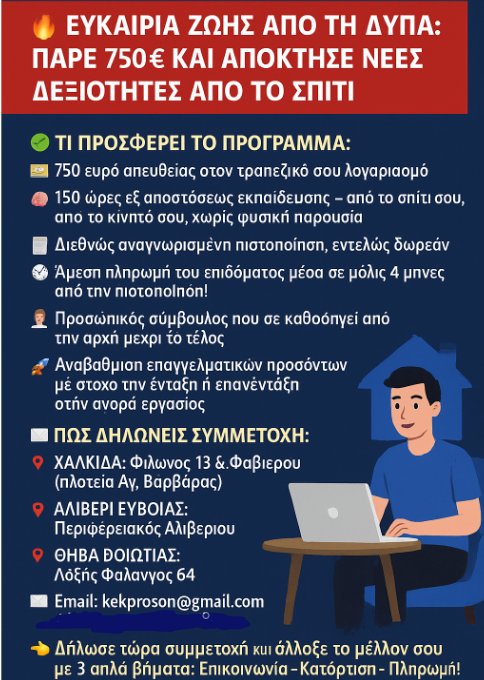 Η ΔΥΠΑ αλλάζει τα δεδομένα στην αγορά εργασίας με το μεγαλύτερο πρόγραμμα κατάρτισης που έχει υλοποιηθεί ποτέ! Αν είσαι άνεργος ή εργαζόμενος, αυτή είναι η στιγμή σου: 170.000 θέσεις σε ένα σύγχρονο πρόγραμμα εξ αποστάσεως κατάρτισης με εκπαιδευτικό επίδομα 750 ευρώ και δωρεάν πιστοποίηση.