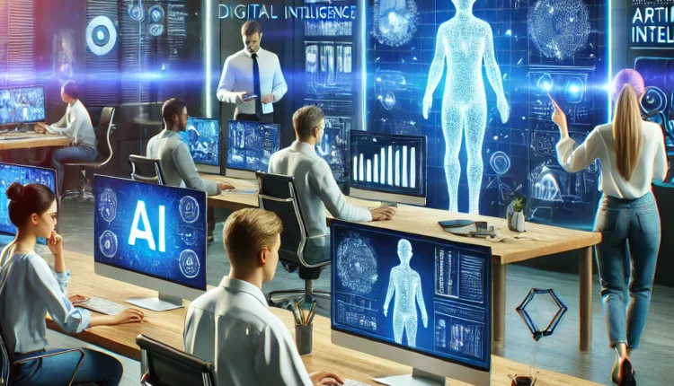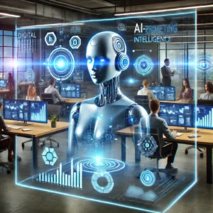 Η εικόνα δείχνει ένα φουτουριστικό digital marketing Agency που προσφέρει τεχνητή νοημοσύνη. Το περιβάλλον είναι μοντέρνο, με ολογραφικές οθόνες, μια ομάδα που συνεργάζεται με έναν εικονικό βοηθό και σχεδιαστές που προκαλούν διαφημίσεις υψηλής τεχνολογίας. Η ατμόσφαιρα είναι φωτισμένη με μπλε και μωβ νεον αποχρώσεις, συμβολίζοντας την καινοτομία.