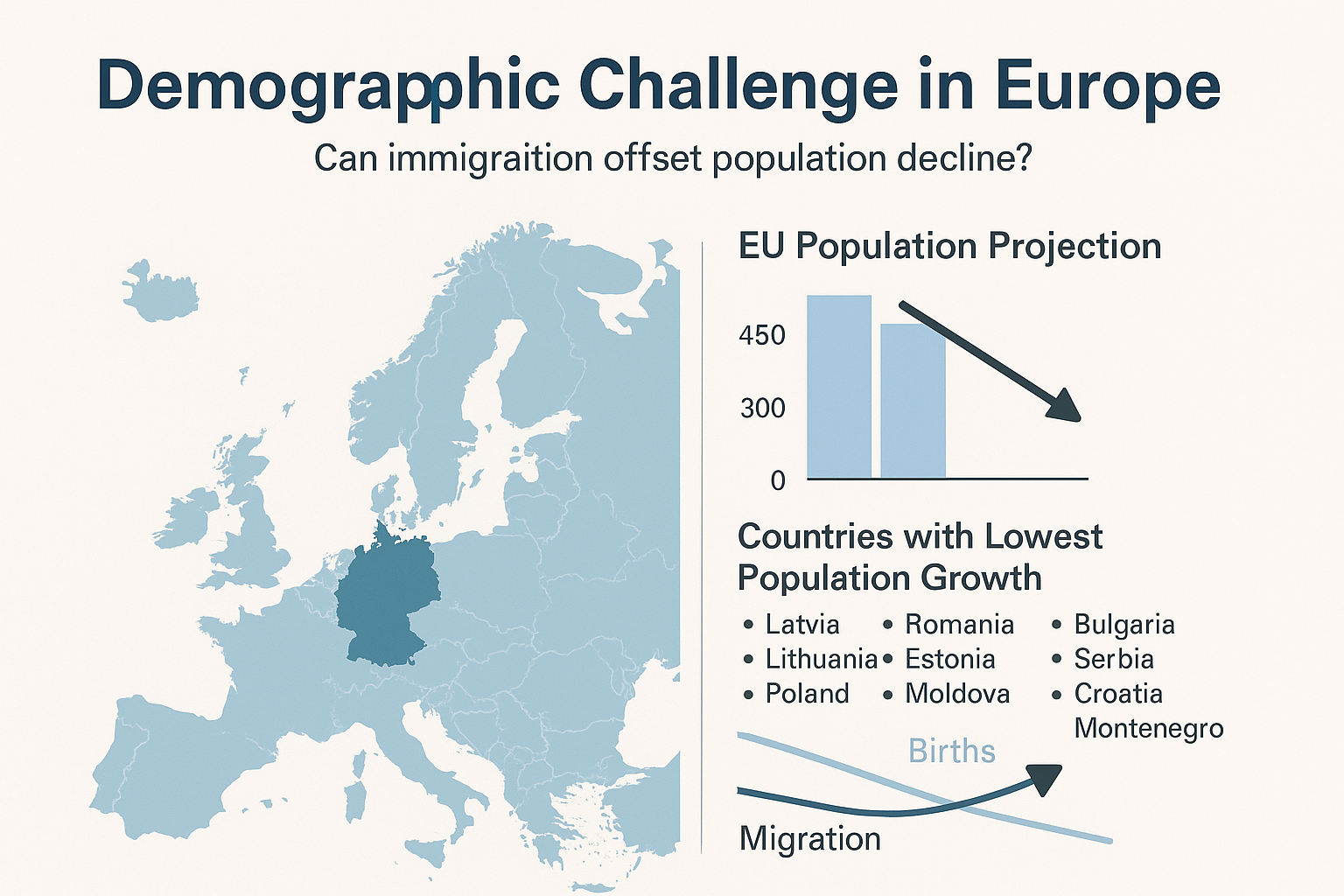 Η Ευρώπη βρίσκεται σήμερα αντιμέτωπη με μια βαθιά και πολυδιάστατη δημογραφική κρίση. Οι γεννήσεις μειώνονται, οι πληθυσμοί γηράσκουν και οι οικονομικά ενεργοί πολίτες λιγοστεύουν. Η Eurostat προβλέπει ότι ο πληθυσμός της Ευρωπαϊκής Ένωσης θα μειωθεί από 447 εκατομμύρια σε 419 εκατομμύρια μέχρι το 2100, μια μείωση της τάξης του 6%, εάν συνεχιστούν οι σημερινές τάσεις (Eurostat, 2023).