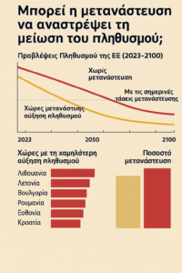Αν δεν υπήρχε η μετανάστευση, η μείωση θα ήταν δραματική: ο πληθυσμός της ΕΕ θα υποχωρούσε κάτω από τα 300 εκατομμύρια κατοίκους (Eurostat, 2023). Η μετανάστευση φαίνεται να είναι το μόνο στοιχείο που συγκρατεί αυτή τη δημογραφική καθίζηση.