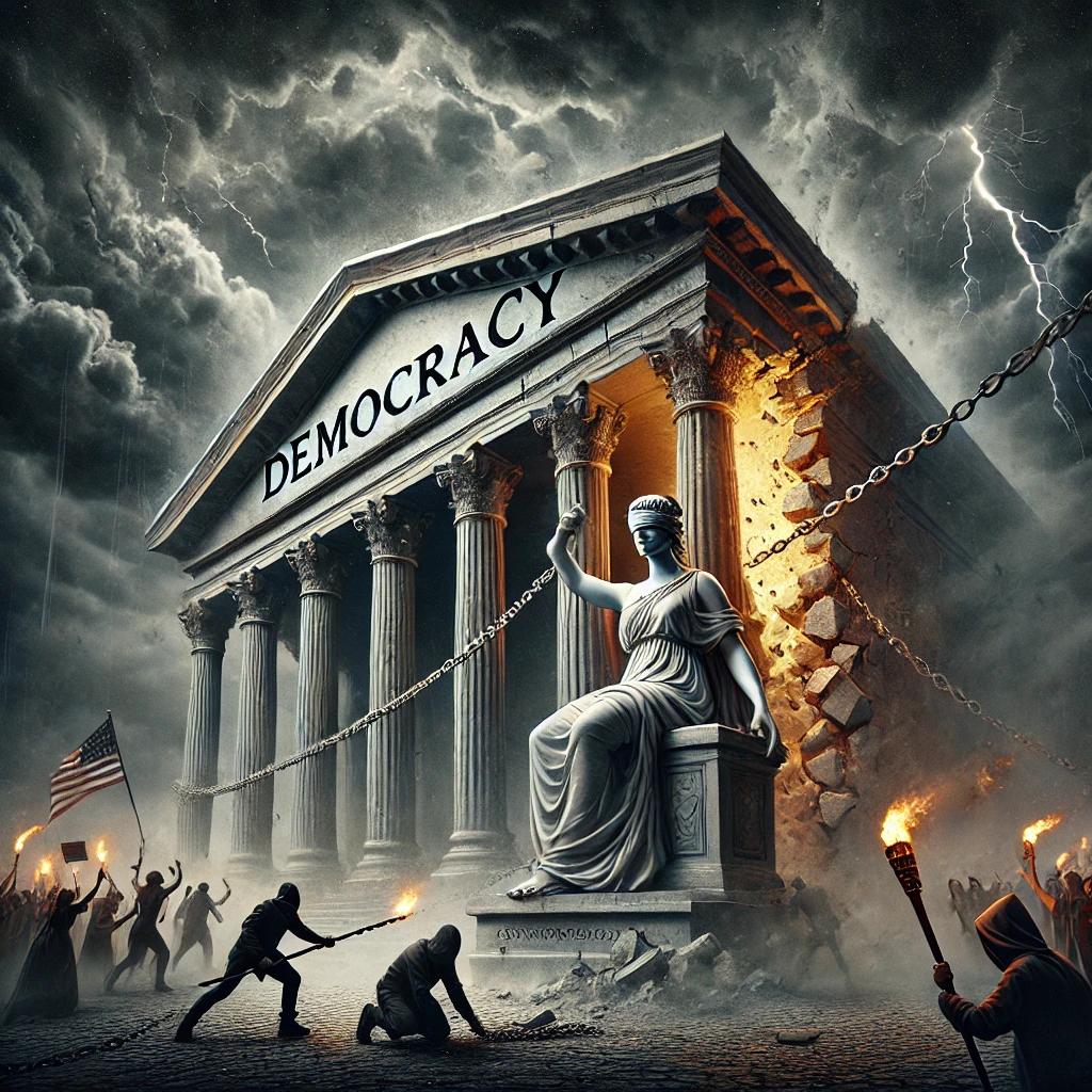 Πάντως, ο τυφώ­νας Τrump γκρε­μί­ζει το αφή­γη­μα της σύγκρου­σης μετα­ξύ δημο­κρα­τι­κής δύσης και αυταρ­χι­κών καθε­στώ­των, γκρε­μί­ζει το αφή­γη­μα και το πρό­σχη­μα του «διε­θνούς δικαί­ου» και προ­βά­λει ξανά το προ­φα­νές «δίκαιο του ισχυ­ρού»  που  πραγ­μα­τι­κά ισχύ­ει στις διε­θνείς σχέ­σεις των χωρών από την επο­χή του Θουκιδίδη..