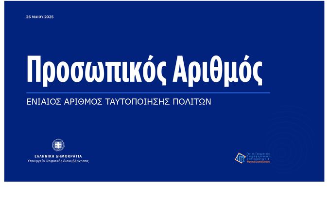 Από τις αρχές Ιου­νί­ου, οι πολί­τες θα έχουν τη δυνα­τό­τη­τα να χρη­σι­μο­ποιούν έναν μονα­δι­κό προ­σω­πι­κό αριθ­μό για όλες τις συναλ­λα­γές τους με το Δημόσιο. Σύμ­φω­να με το υπουρ­γείο, αυτή η εξέ­λι­ξη απο­τε­λεί σημα­ντι­κή και­νο­το­μία που θα αντι­κα­τα­στή­σει τους τομε­α­κούς αριθ­μούς, όπως τον ΑΦΜ και τον ΑΜΚΑ