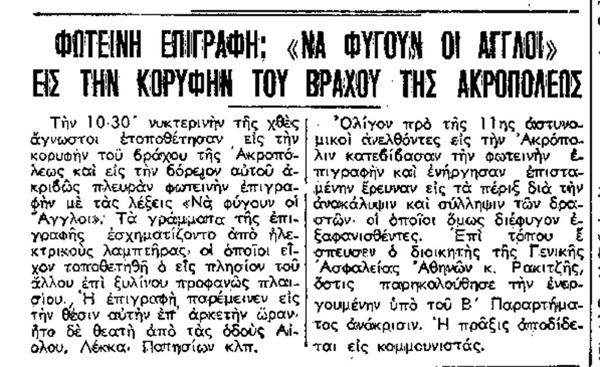 Το ημερολόγιο έδειχνε 2 Φεβρουαρίου 1947 όταν η Ακρόπολη «φωτίζεται» από μια επιγραφή που λέει: «Να φύγουν οι Αγγλοι»! Οι δράστες συλλαμβάνονται και η αστυνομία ανακοινώνει ότι πίσω από το γεγονός κρύβεται κομμουνιστικός δάκτυλος.…