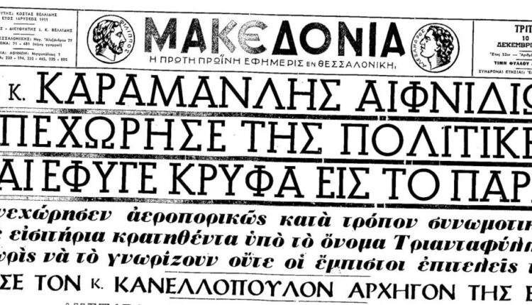 9 Δεκεμβρίου 1963. Ο Κωνσταντίνος Καραμανλής αποχωρεί από την ηγεσία της ΕΡΕ και κάτω από συνθήκες απόλυτης μυστικότητας αναχωρεί για το Παρίσι. Είχαν προηγηθεί η δολοφονία Λαμπράκη και οι εκλογές της 3ης Νοεμβρίου 1963…