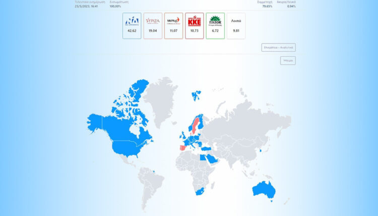Η ενσωμάτωση των ψήφων από τους Έλληνες του Εξωτερικού ολοκληρώθηκε. Οι απόδημοι Έλληνες είχαν ψηφίσει από το Σάββατο 20 Μαΐου, μία ημέρα πριν ανοίξουν οι κάλπες στην Ελλάδα, και ανέδειξαν νικήτρια σε αυτή την άτυπη περιφέρεια τη Νέα Δημοκρατία…