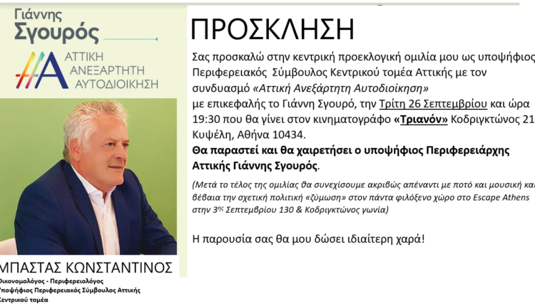Σας προσκαλώ στην κεντρική προεκλογική ομιλία μου ως υποψήφιος Περιφερειακός Σύμβουλος Κεντρικού Τομέα Αττικής με τον συνδυασμό “Αττική Ανεξάρτητη Αυτοδιοίκηση¨ με επικεφαλής τον Γιάννη Σγουρό, την Τρίτη 26 Σεπτεμβρίου και ώρα 19:30 που θα γίνει στον κινηματογράφο “Τριανόν” Κοδριγκτώνος 21 Κυψέλη Αθήνα 104 34