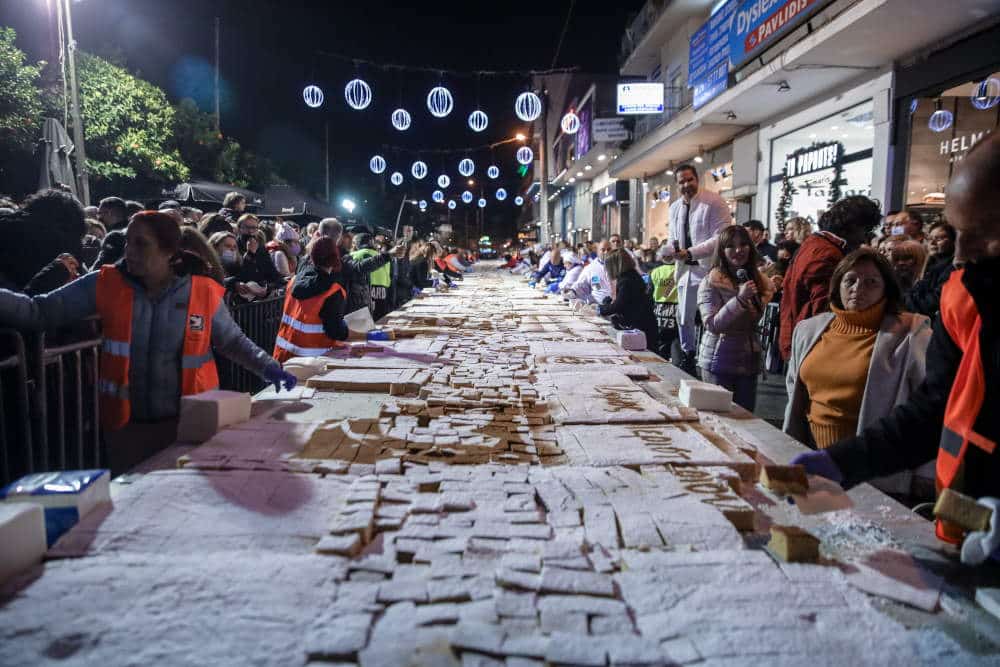 Μία απίστευτη εικόνα δημιουργήθηκε στο Περιστέρι, με τη γιγαντιαία βασιλόπιτα, με περισσότερα από 50.000 κομμάτια να καλύπτει όλο το μήκος της οδού, παράπλευρα από την πλατεία Δημαρχείου.