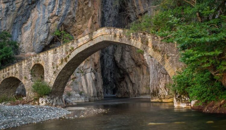 Οι δύο τεράστιοι βράχοι που ορθώνονται σαν συμπληγάδες πέτρες πίσω από το γεφύρι προκαλούν δέος