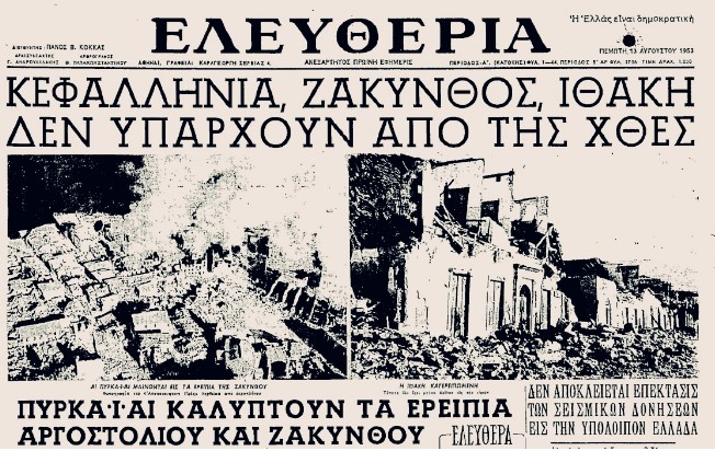 Σαν σήμερα, 12 Αυγούστου 1953, καταστροφικός σεισμός, μεγέθους 7,2 Ρίχτερ, πλήττει τα Επτάνησα, με αποτέλεσμα 871 άνθρωποι να χάσουν τη ζωή τους, 1.690 να τραυματιστούν και 145.052 να μείνουν άστεγοι.