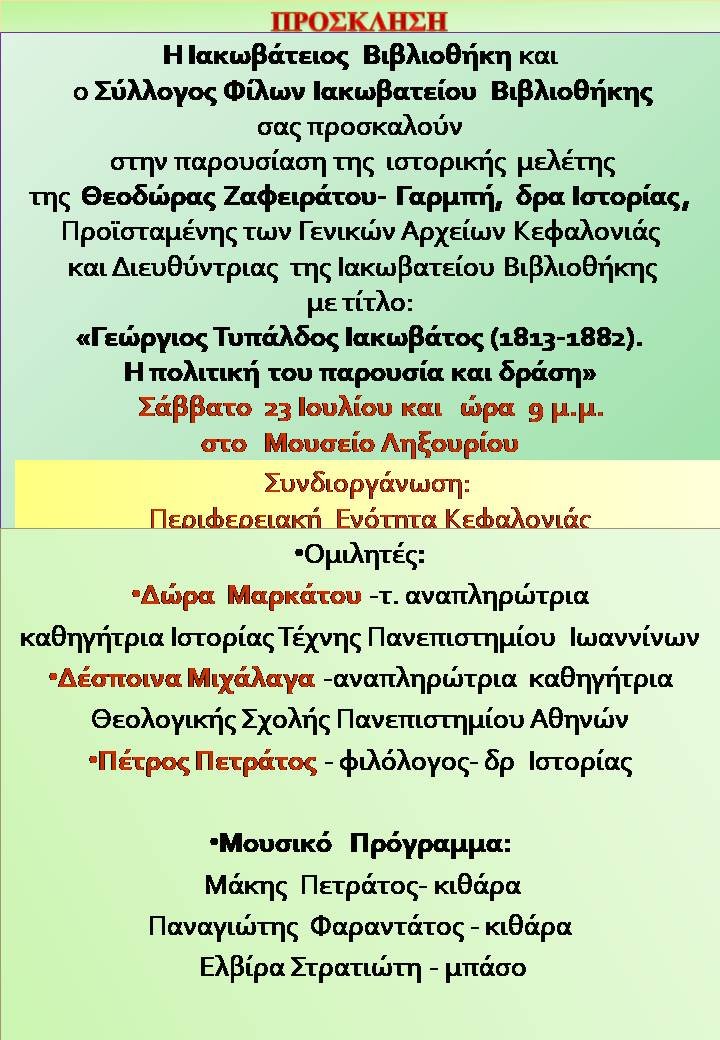 ΛΗΞΟΥΡΙ ΕΚΔΗΛΩΣΕΙΣ Σάββατο 23 Ιουλίου AgendaΛηξούριΠ.Ε. Κεφαλληνίας By hellas2day On Ιούλ 23, 2022 ΙΑΚΩΒΑΤΕΙΟΣ ΒΙΒΛΙΟΘΗΚΗ Σας περιμένουμε το Σάββατο 23 Ιουλίου και ώρα 9 μ.μ στο χώρο του Μουσείου - Διαφήμιση -- Διαφήμιση -- Διαφήμιση -- Διαφήμιση - Share