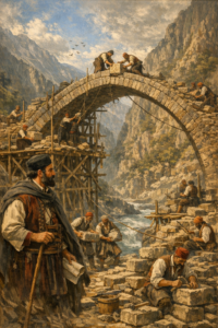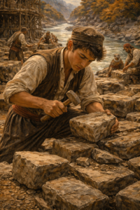 Οι πέτρες ανέβαιναν μία μία. Ο ήχος του σφυριού, το τρίξιμο του ξύλου, το βουητό του ποταμού από κάτω· όλα έμοιαζαν πιο δυνατά. Κι εγώ κρατούσα τη γραμμή τους, προσπαθώντας να μην αφήσω τον φόβο να μου τρέμει το χέρι. Δεν σήκωσα το βλέμμα ούτε στιγμή. Ήξερα πως, αν χαθώ, θα χαθεί μαζί μου όλο το έργο.