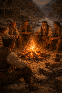 Τα βράδια καθόμασταν γύρω από τη φωτιά, όταν πια έπεφτε το σκοτάδι και το κρύο έσφιγγε. Οι άνθρωποι του χωριού έφερναν ψωμί και κρασί, άλλοτε λίγο, άλλοτε περισσότερο, μα οι κουβέντες έμεναν μετρημένες. Ο ξένος δεν γίνεται δικός σου εύκολα, κι εμείς ήμασταν ακόμη ξένοι.