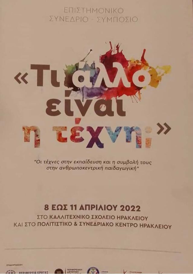 Συνεχίζεται και σήμερα Κυριακή το επιστημονικό συμπόσιο με τίτλο «Τι άλλο είναι τέχνη; Οι τέχνες στην εκπαίδευση και η συμβολή τους την ανθρωποκεντρική παιδαγωγική», που λαμβάνει χώρα στο Καλλιτεχνικό Σχολείο και στο Πολιτιστικό και Συνεδριακό Κέντρο Ηρακλείου από 8 και θα λήξει τις εργασίες του στις 11 Απριλίου 2022