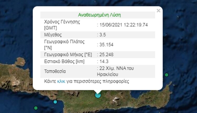 Σεισμός έγινε 22′ λεπτά μετά τις 3 το μεσημέρι της Τρίτης (15.06.2021) στο Ηράκλειο Κρήτης.