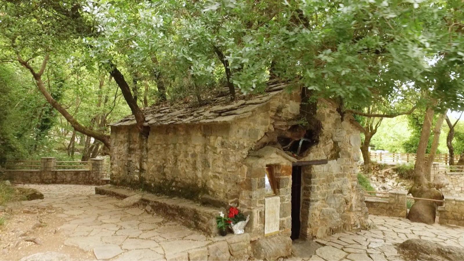 Δεκαεφτά μεγάλα δέντρα ξεπηδούν από την στέγη του μικρού πέτρινου ναού στη περιοχή της Βάστας στη Μεγαλόπολη.