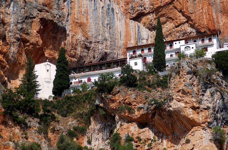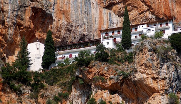 Ιερά Μονή Παναγίας Έλωνας — Είναι κτισμένη σε ένα κάθετο και επιβλητικό κόκκινο βράχο, δίνοντας την εντύπωση ότι αιωρείται
