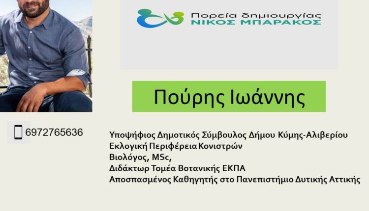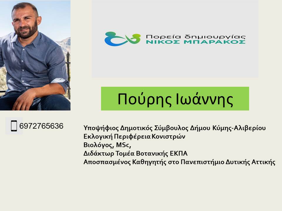Γιάννης Πουρής: Είμαι γεννημένος και μεγαλωμένος στον Δήμο Κύμης-Αλιβερίου. Είμαι διδάκτορας του τμήματος Βιολογίας του Εθνικού και Καποδιστριακού Πανεπιστημίου Αθηνών και εργάζομαι ως καθηγητής στο Πανεπιστήμιο Δυτικής Αττικής και ασχολούμαι ενεργά με την κοινωνία μας εδώ και πολλά χρόνια.
