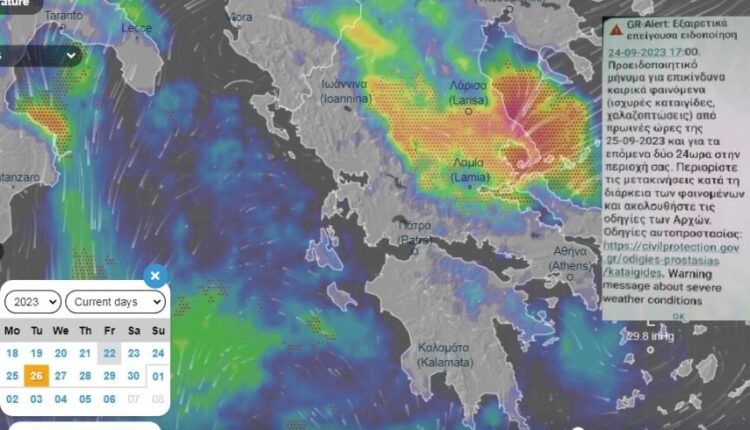 Μήνυμα μέσω του 112 εστάλη σε κατοίκους στην ευρύτερη περιοχή της Θεσσαλίας, των Σποράδων, της Φθιώτιδας και της Βόρειας Εύβοιας προειδοποιώντας για επικίνδυνα καιρικά φαινόμενα (ισχυρές καταιγίδες, χαλαζοπτώσεις) από τις πρωινές ώρες της Δευτέρας 25/9 και για τα επόμενα δύο 24ώρα…