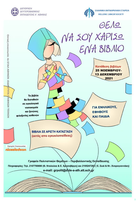 Η Διεύθυνση Δευτεροβάθμιας Εκπαίδευσης Α’ Αθήνας, εν όψει των Χριστουγέννων, σας καλεί να λάβετε μέρος στη δράση “Θέλω να σου χαρίσω ένα βιβλίο”, συγκεντρώνοντας βιβλία που θα χαριστούν σε νοσοκομεία και ξενώνες ασθενών και συγγενών τους.