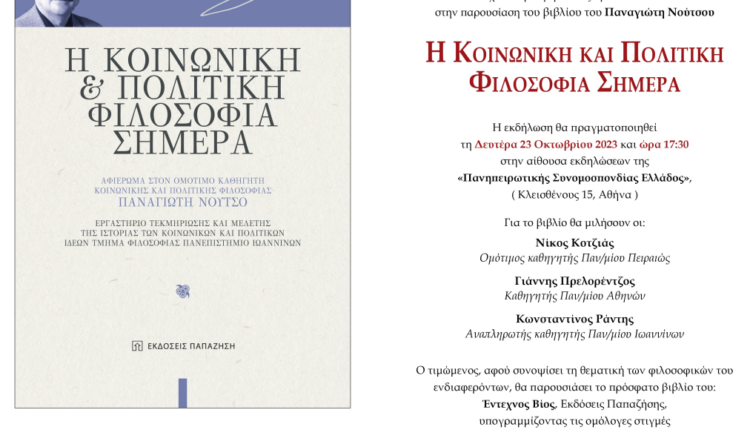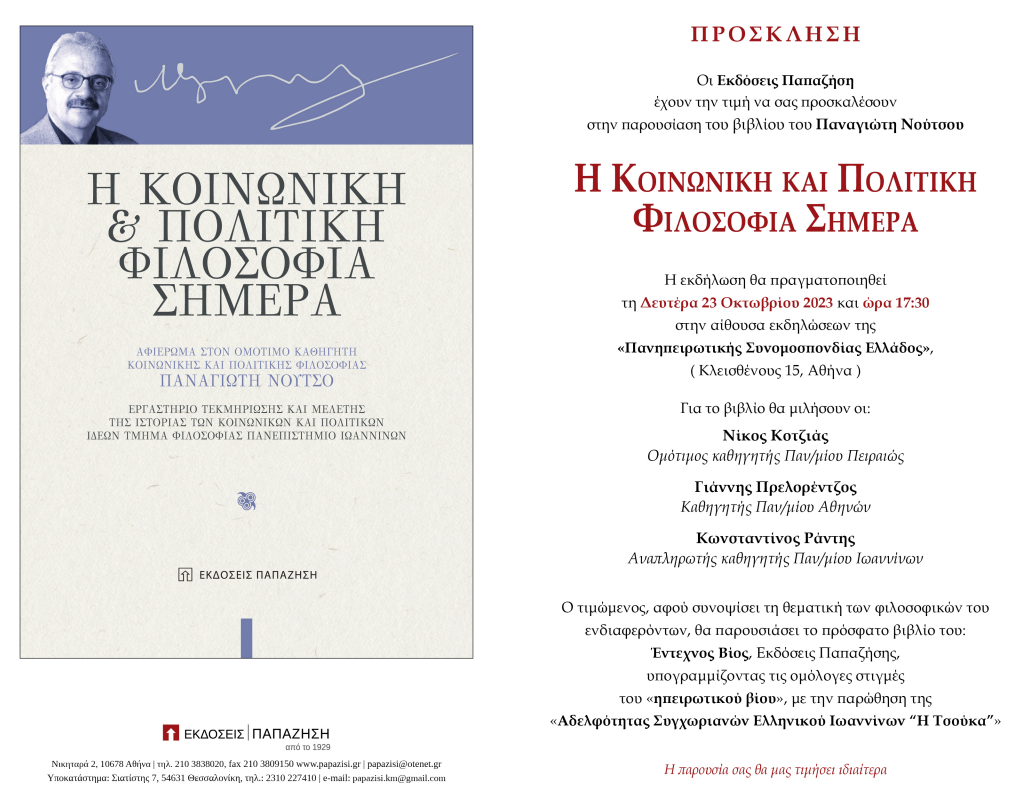 Δευτέρα 23 Οκτωβρίου 2023 και ώρα 17:30 στην αίθουσα εκδηλώσεων της ”Πανηπειρωτικής Συνομοσπονδίας Ελλάδος” (Κλεισθένους 15. Αθήνα).