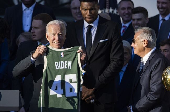 Γιάννη, έβαλες 50 πόντους στο Game 6. Πενήντα! Το χειρότερο είναι πως θυμάμαι και τα δύο πρωταθλήματα των Μιλγουόκι Μπακς» είπε γελώντας ο Πρόεδρος Τζο Μπάιντεν και πρόσθεσε: «Είμαι 26 χρονών Γιάννη. Τώρα ξεκινάς! Αυτό που το κάνει ακόμη πιο ιδιαίτερο είναι ότι βρίσκεσαι εδώ με τον αδελφό σου. Είναι παιδιά μιας οικογένειας μεταναστών από τη Νιγηρία, που πήγαν στην Ελλάδα. Αυτό είναι σπουδαίο.